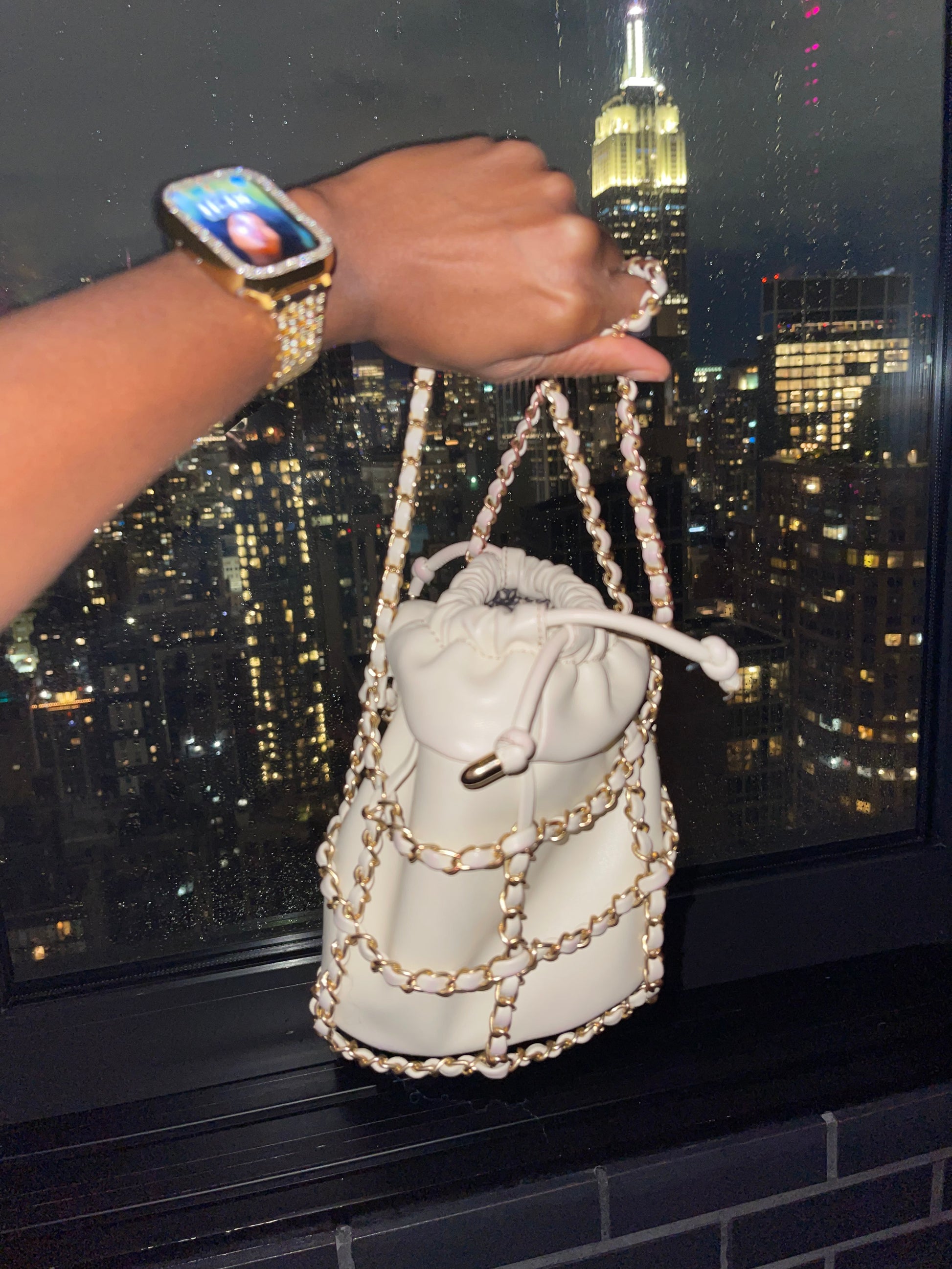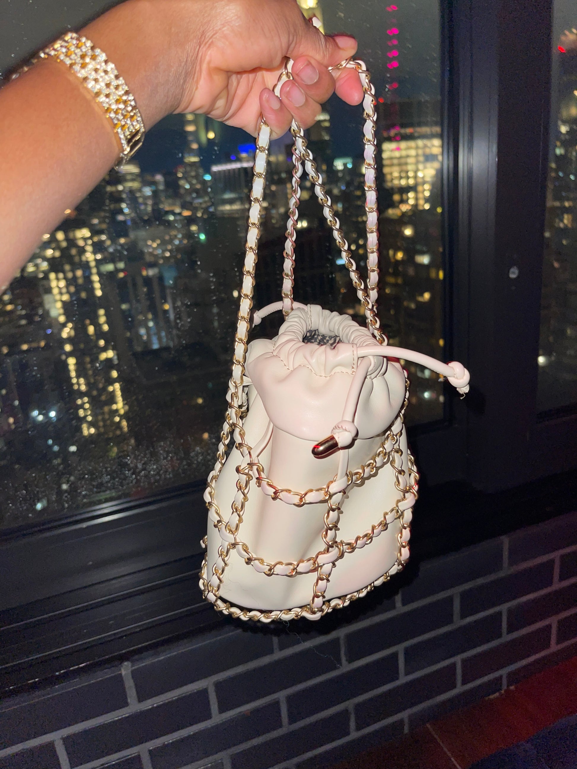 Doll this Adina oat milk bag is essential this season to complete any look. Featuring a oat milk vegan leather material with a gold chain detailing around the pouch. And drawstring with a shoulder strap and 1 slip pocket for a glam finish. Pair this handbag with the Tosca dress for the perfect brunch look.